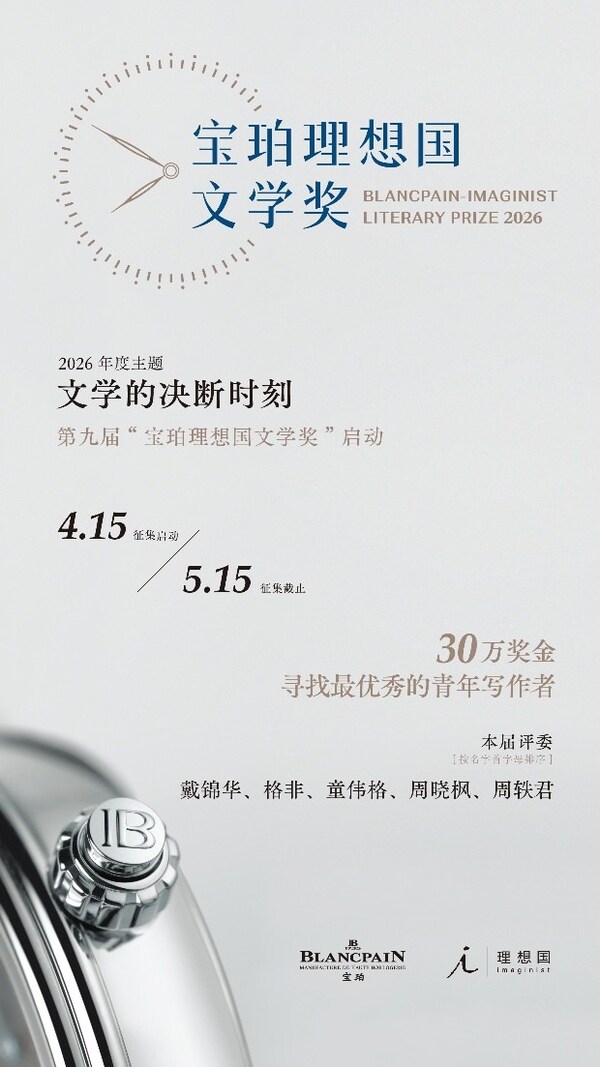 BEIJING, April 24, 2026 /PRNewswire/ — The 9th Blancpain-Imaginist Literary Prize was officially launched on April 15, 2026. From today through May 15, the organizing committee of the Prize accepts submissions from the organizing committee will accept submissions from publishing houses, publishing companies, or individual authors. The final winner will be announced at the awards ceremony in late October. The young writer honored with the top prize will receive RMB 300,000 in writing support. The other four shortlisted authors will each receive the Blancpain Young Friend Award, a certificate of shortlist selection, and a writing fee of RMB 20,000, in recognition of their creative dedication and to encourage their ongoing literary pursuits.
