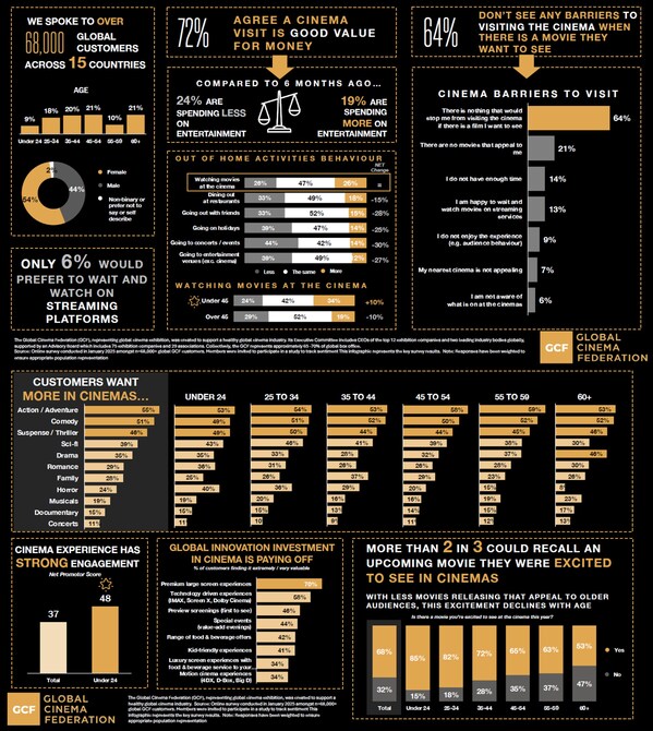 SYDNEY, March 20, 2025 /PRNewswire/ — The Global Cinema Federation (GCF), representing global cinema exhibition, is excited to announce the results of its latest global customer research, highlighting the voices of consumers worldwide. The GCF was created to support a healthy global cinema industry. Its Executive Committee, currently chaired by EVT CEO Jane Hastings, includes CEOs of the top 12 exhibition companies and two leading industry bodies globally, supported by an Advisory Board which includes 75 exhibition companies and 29 associations. Collectively, the GCF represents approximately 65 -70% of global box office.