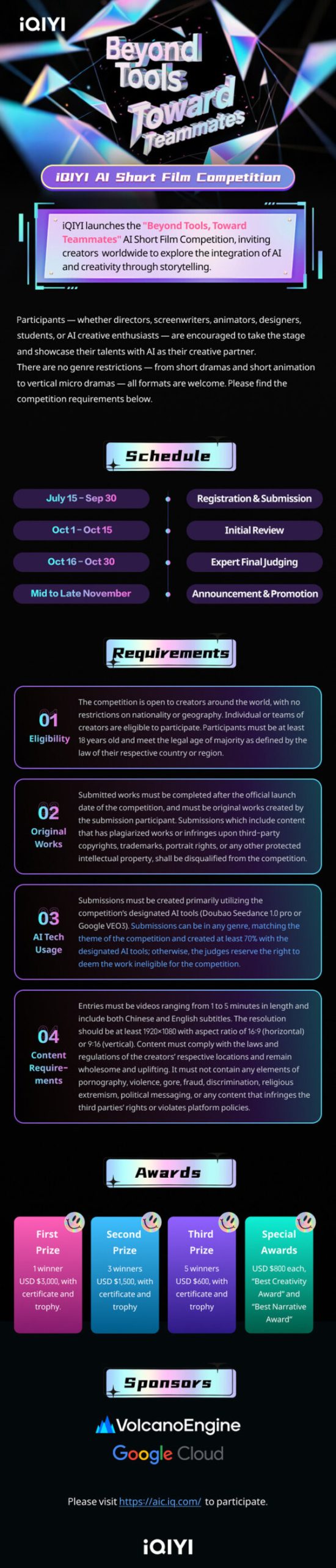 BEIJING, July 11, 2025 /PRNewswire/ — On July 10, iQIYI, China’s leading online entertainment platform, is excited to announce the launch of the “Beyond Tools, Toward Teammates” AI Short Film Creation Competition, a global initiative designed to inspire the next generation of storytellers to redefine what’s possible with AI-powered video creation. Organized by iQIYI International in partnership with Google and ByteDance’s Volcano Engine, the competition aims to accelerate the adoption of cutting-edge AI creative tools for visual storytelling, empowering creators to innovate and explore fresh ways to streamline the creative process to focus on their artistic expression.