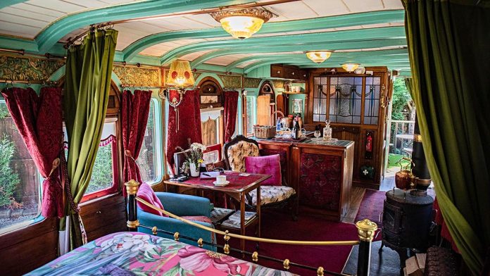 A retired wallpaper designer has turned a 19th-century train carriage into a luxury Airbnb stay at a former railway station.