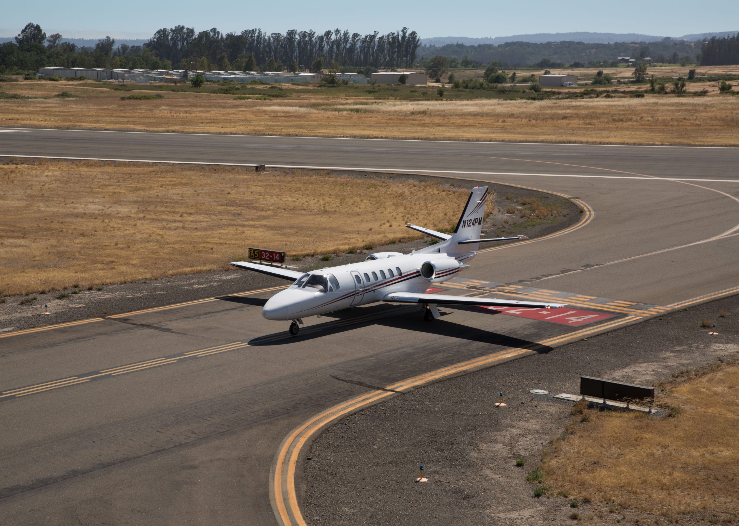A Cessna Citation jet aircraft is viewed at Charles M. Schulz Sonoma County Airport in this aerial photo taken on June 1, 2021, near Healdsburg, California.