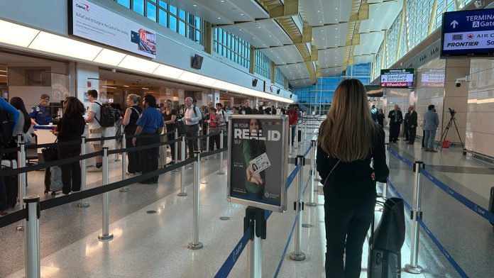 REAL ID sign in a wideshot of an airport full of people.