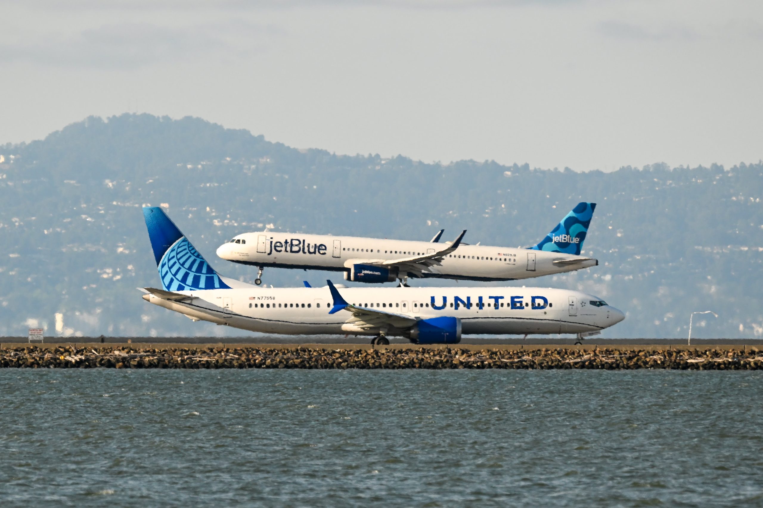 A United Airlines plane takeoff as a JetBlue plane is landing at San Francisco International Airport (SFO) in San Francisco, California, United States on June 8, 2023.