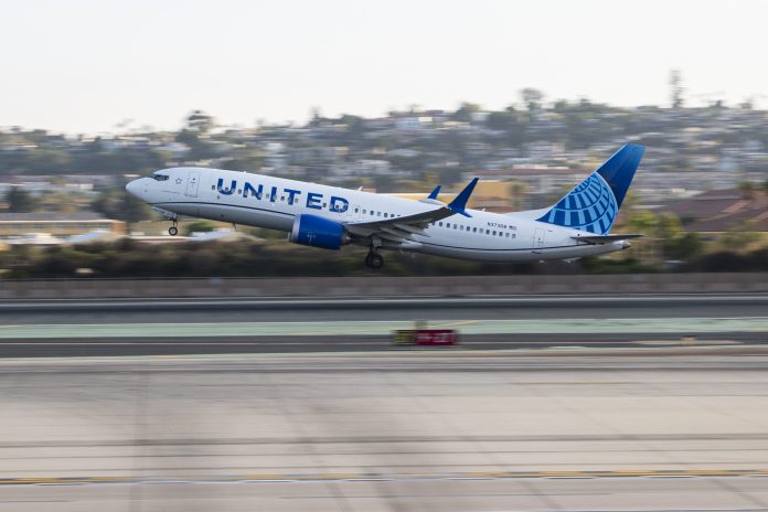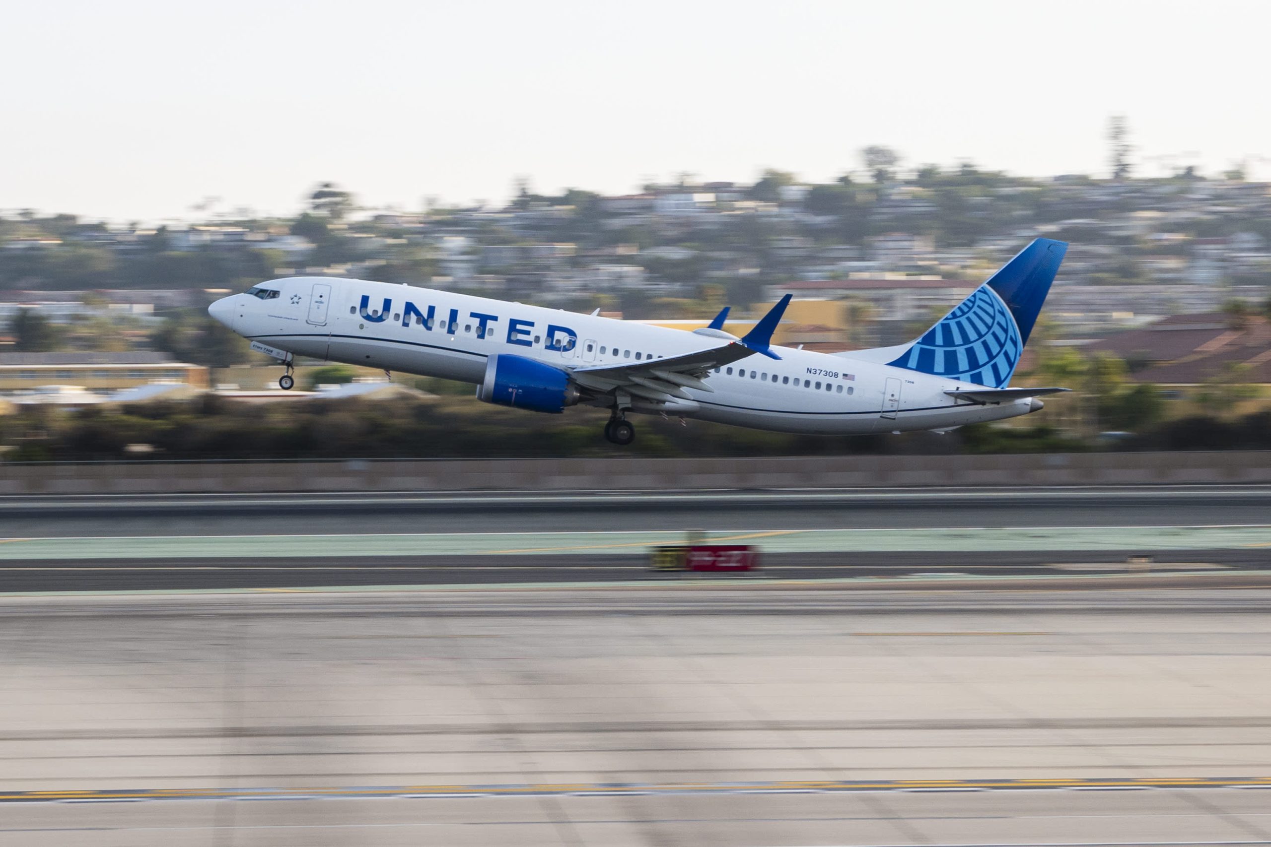A United Airlines Boeing 737-MAX 8 aircraft departs at San Diego International Airport en route to New York on Aug. 24, 2024.